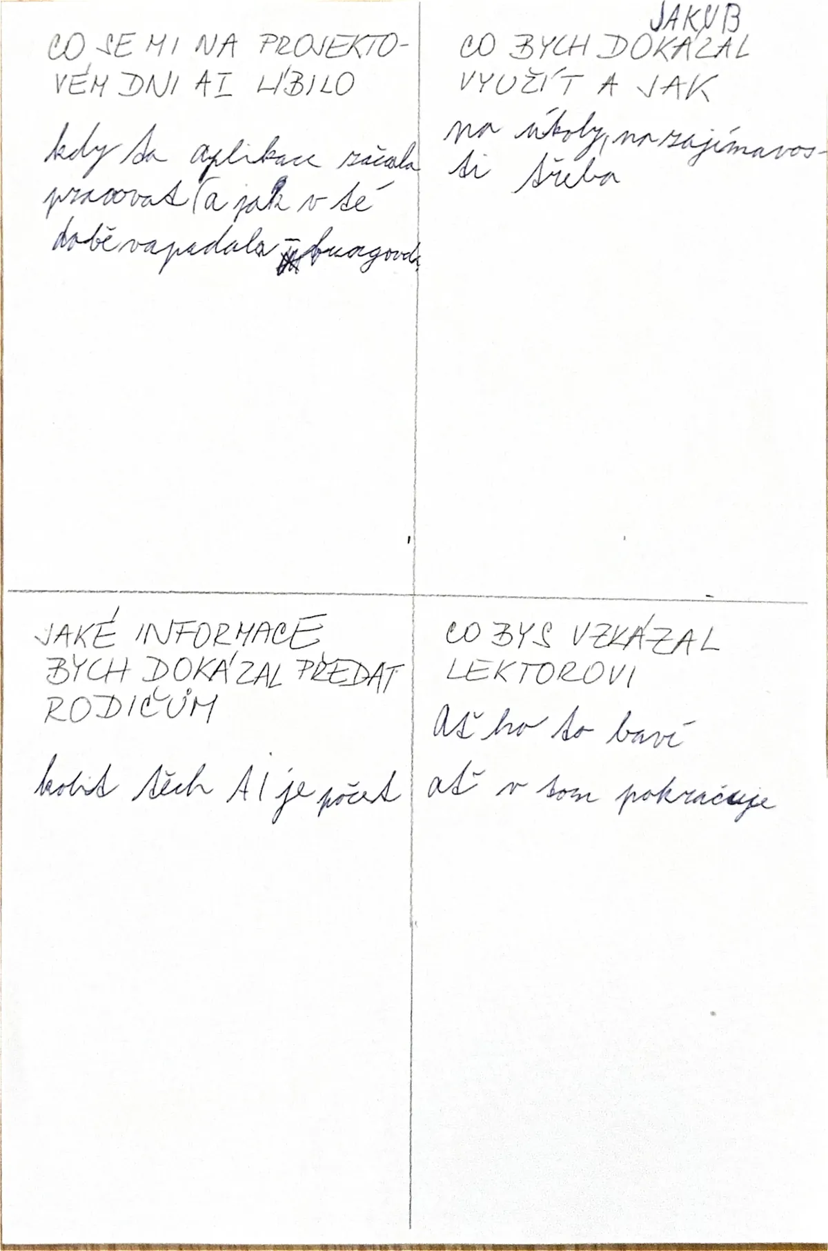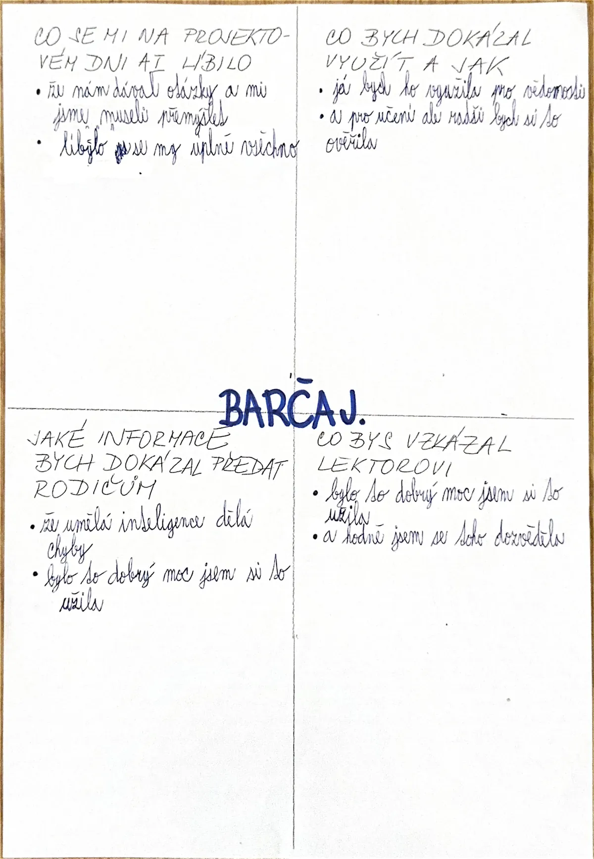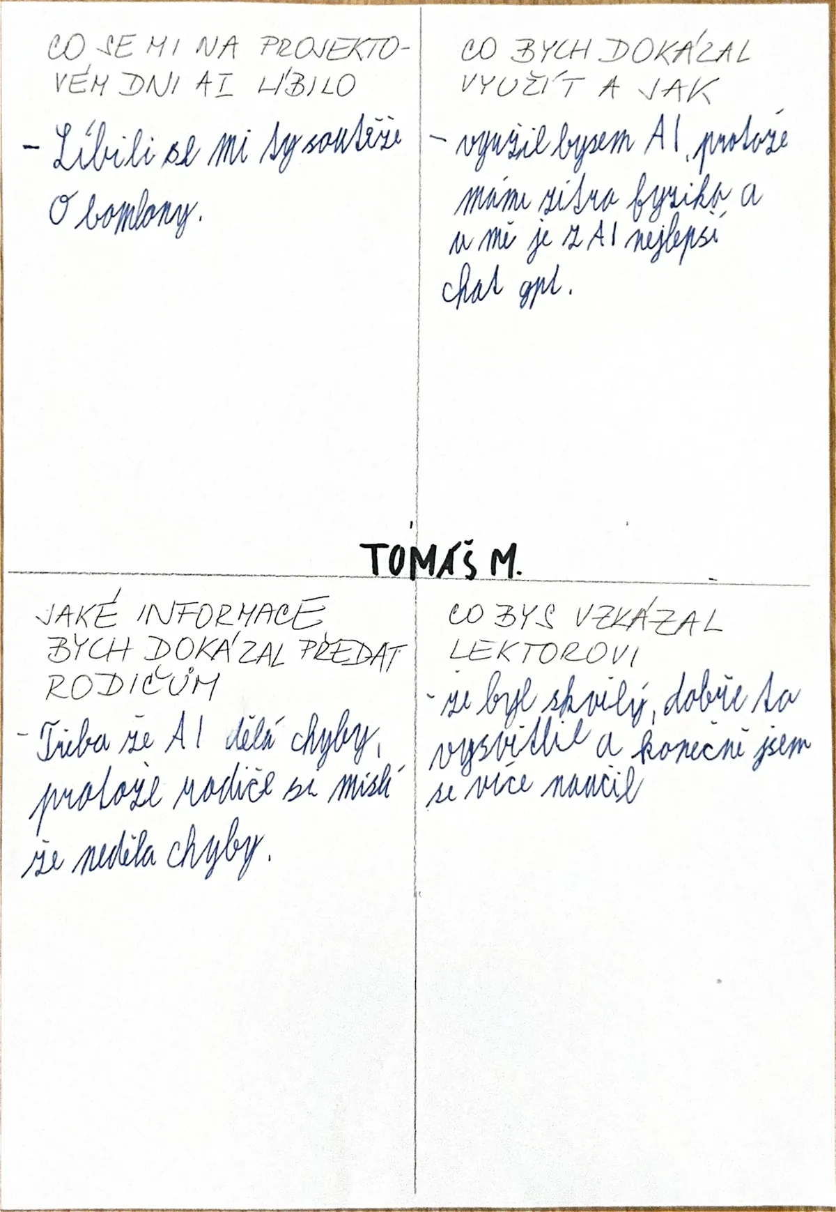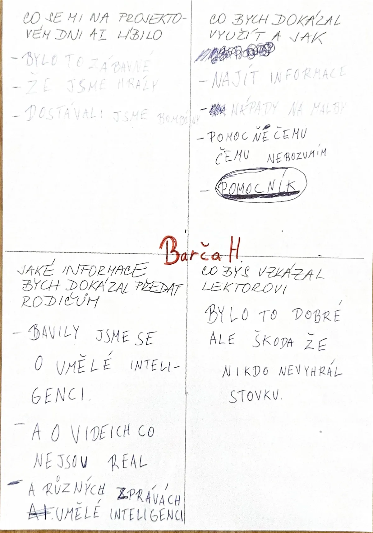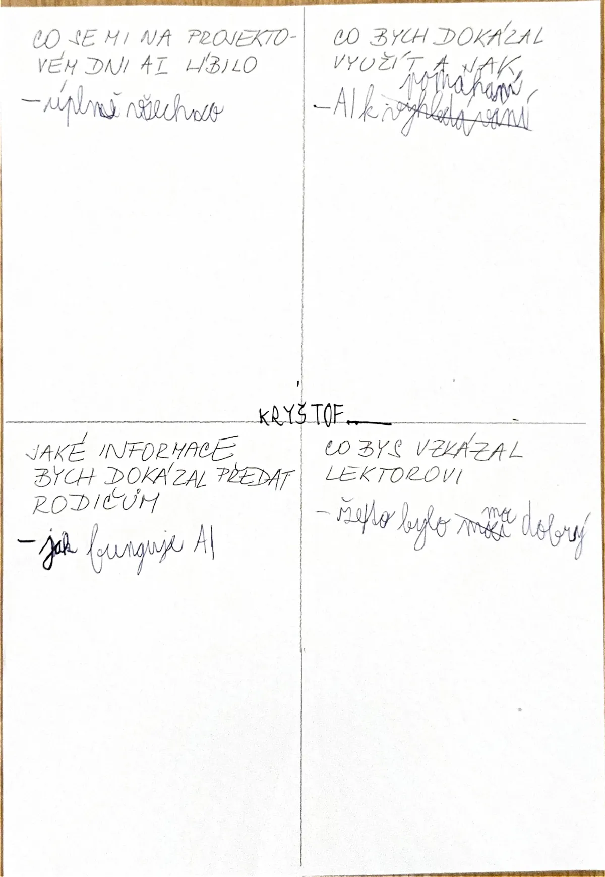 “Akce se mi moc líbila, byla zábavná. Dozvěděl jsem se, co je to AI a kde se s ní můžu setkat. Bavilo mě, když jsme si mohli AI sami vyzkoušet.”